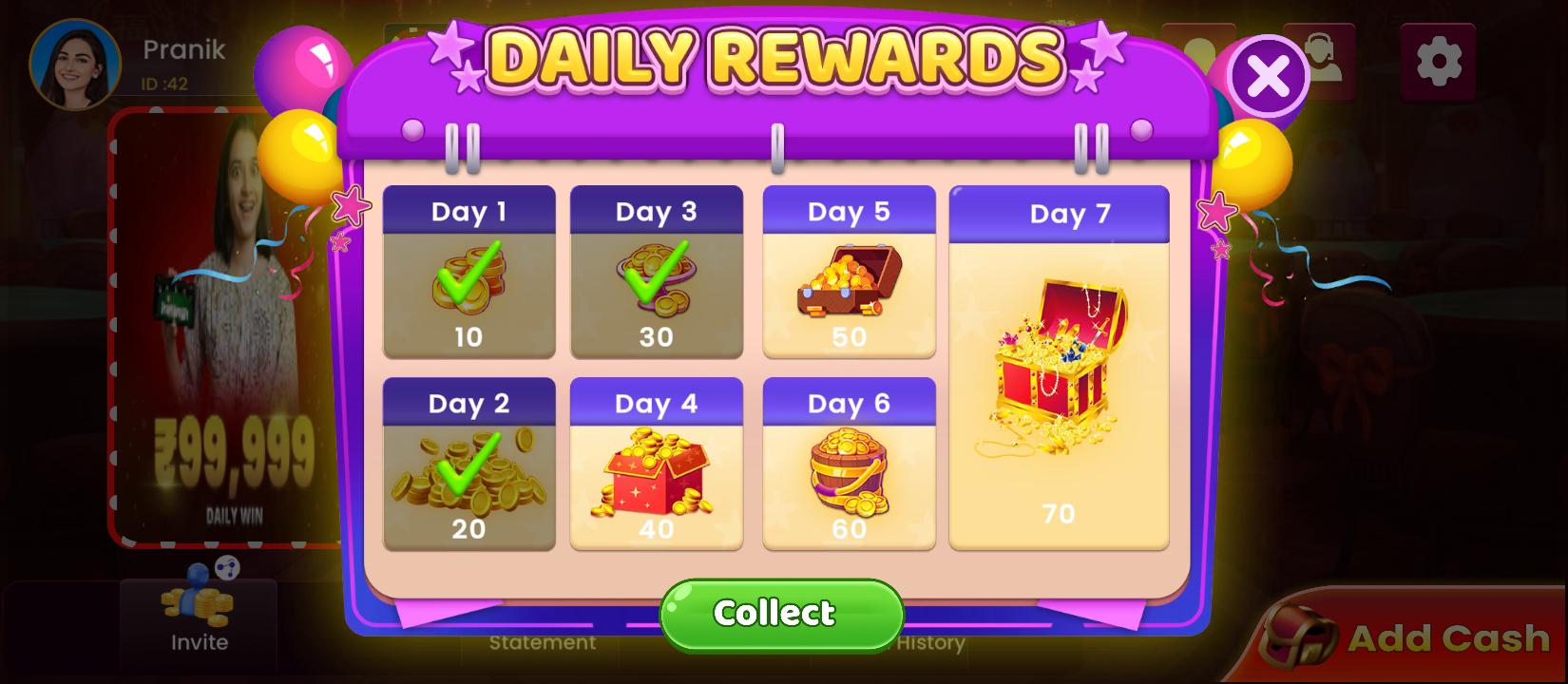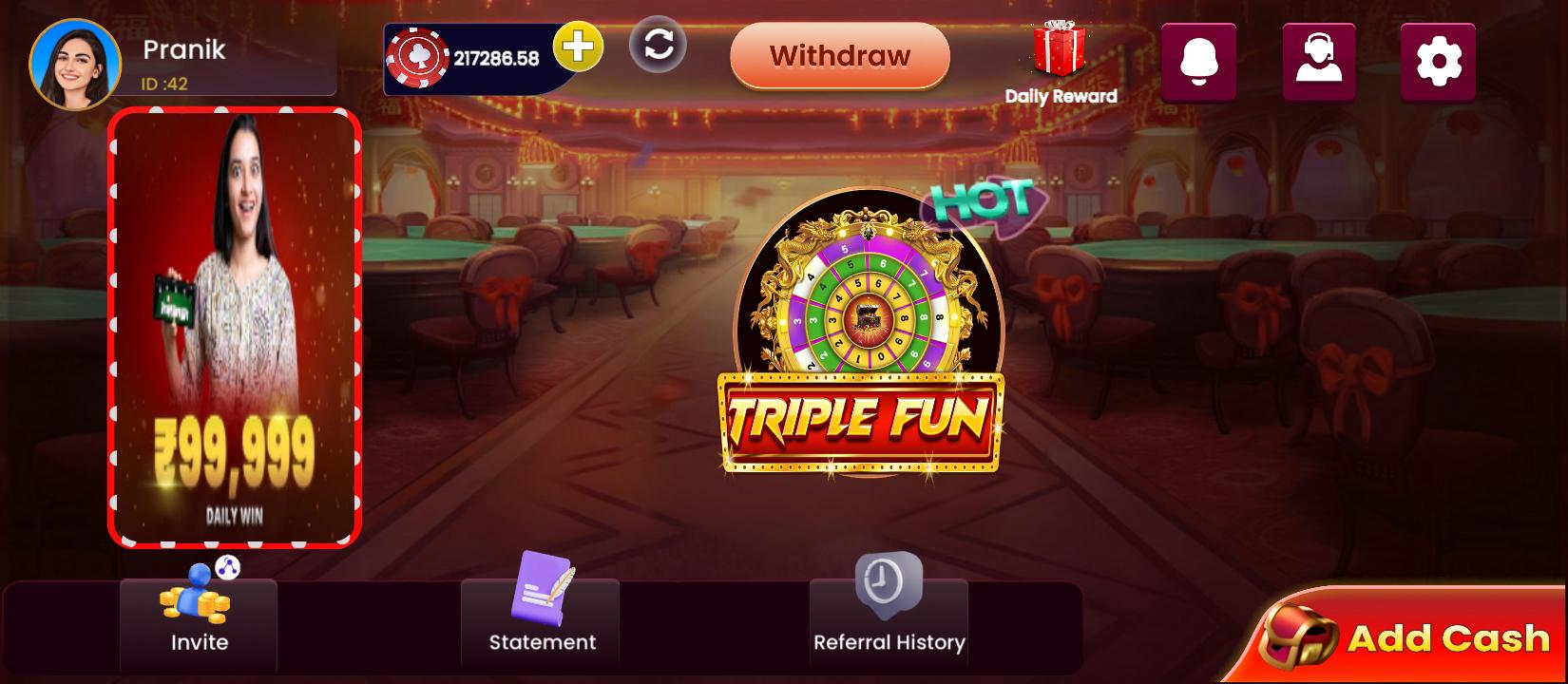 Daily Bonus: Claim Free chips everyday in Triple fun. Win a daily bonus of up to ₹30,000 in chips!